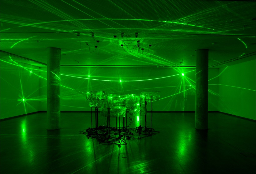 (lasers, stands, fluorescent pigment, mirror foil, Japanese paper)