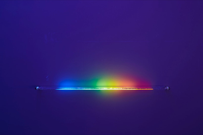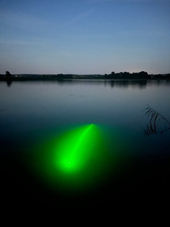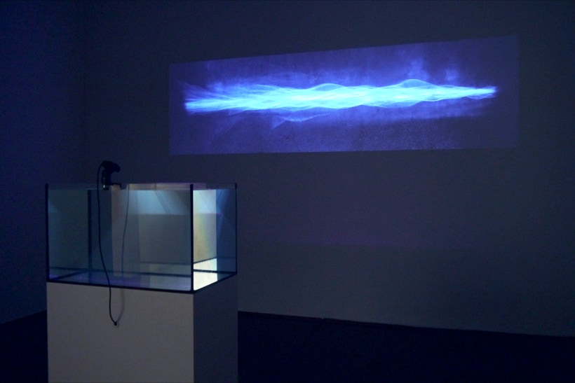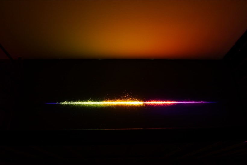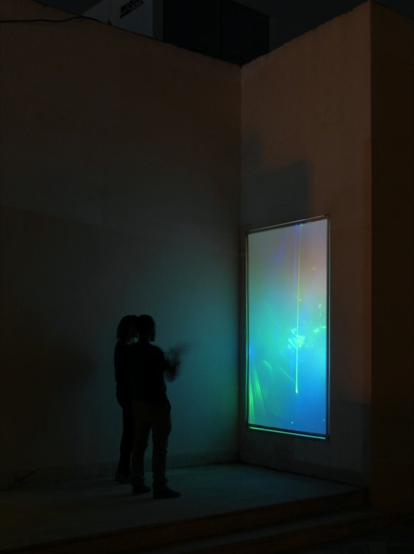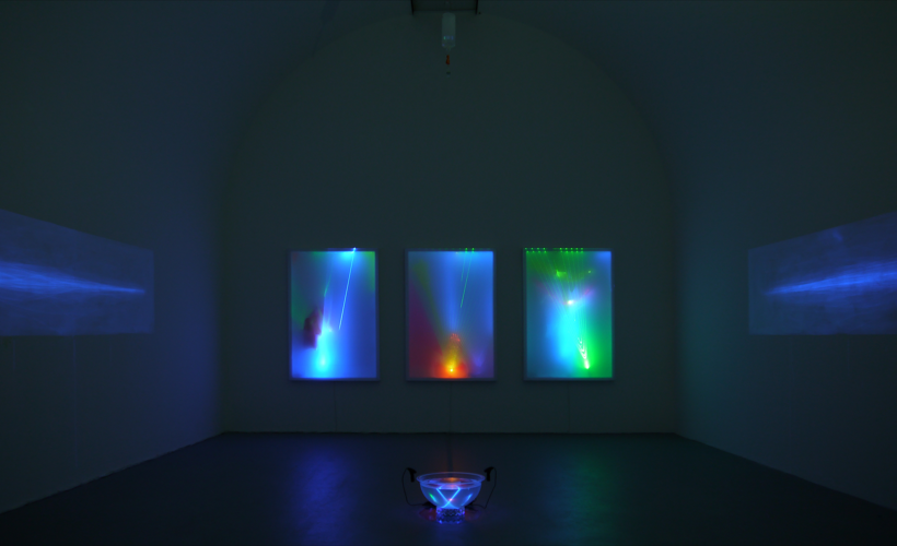 (line laser, glass basin, water, plinth, fluorescent pigment)