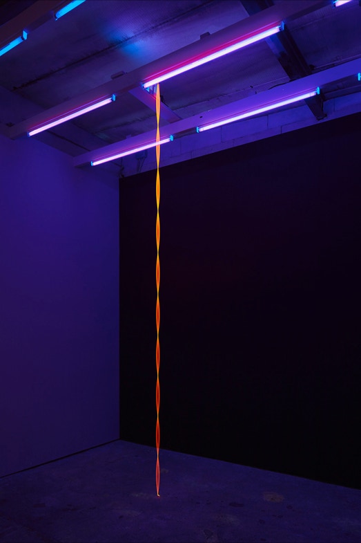(wood, crepe de chine fabric, lasers, Japanese paper, fluorescent pigments)